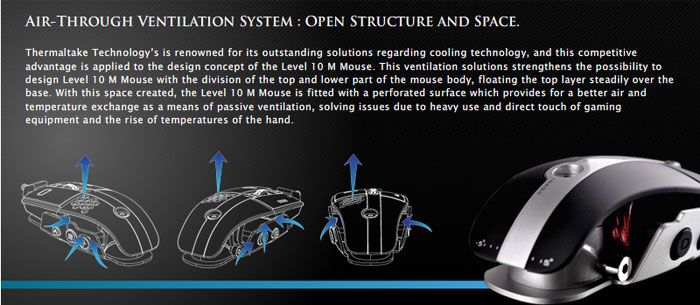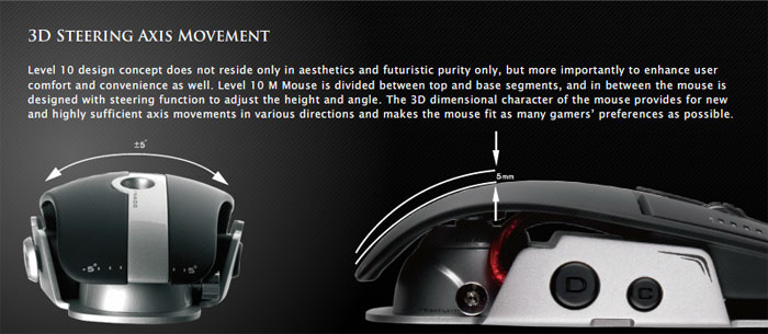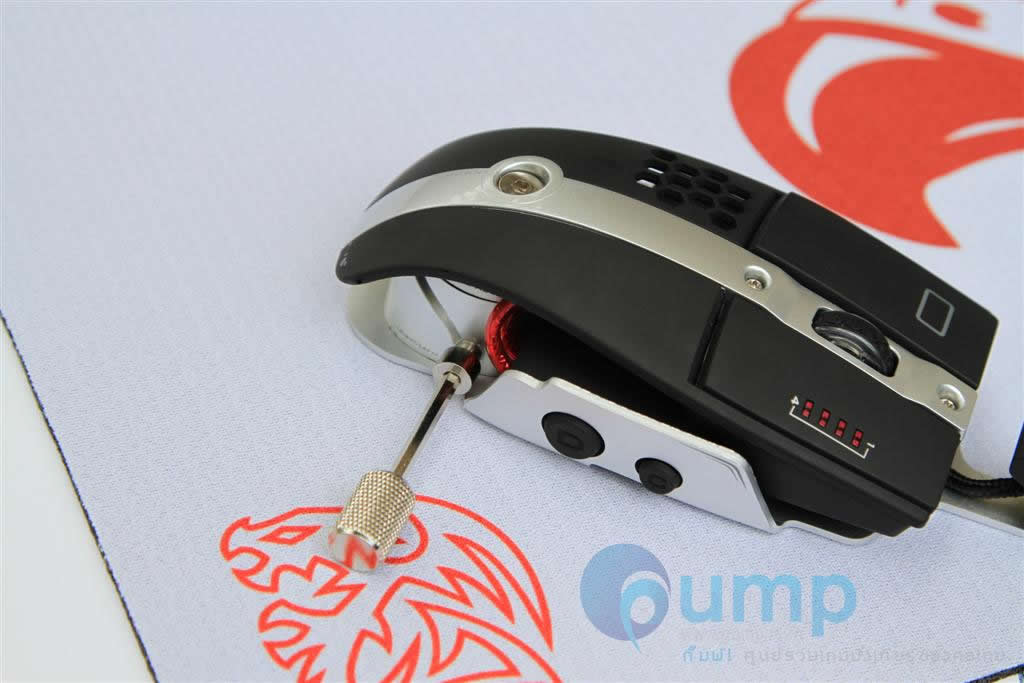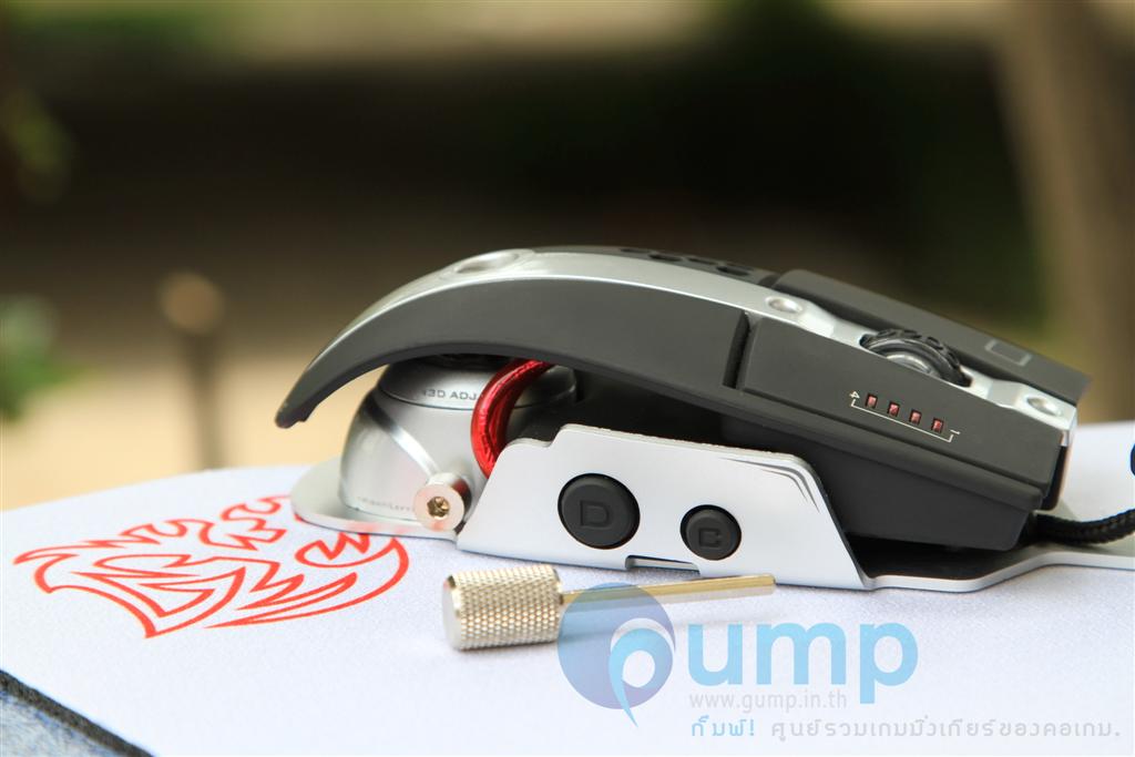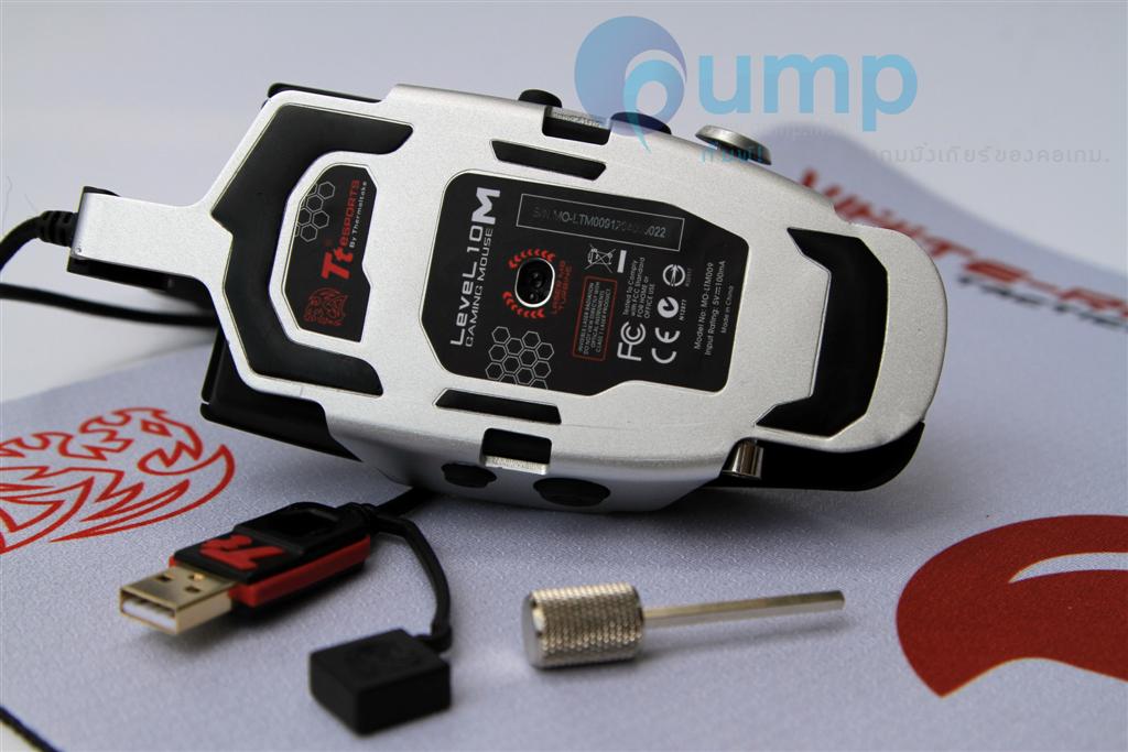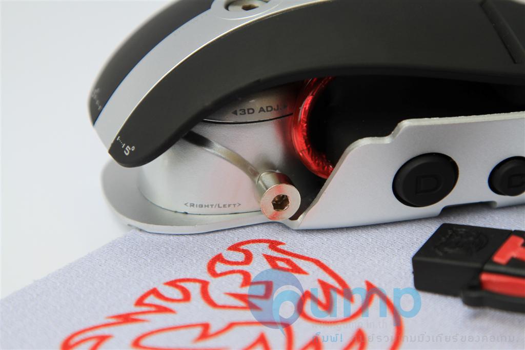ในด้านการใช้งาน : ตอนแรกจับไม่ค่อยชินมือเท่าไหร่ คงเพราะจับเมาท์ถูกๆ มานาน ฮ่าๆ แต่พอไขปรับตำแหน่งให้เหมาะกับมือเราแล้ว ไม่เกิน 1 ชั่วโมง รับรองได้ครับ จะติดใจเลยหล่ะ ใครจะคิดว่าเมาท์เด่วนี้ ก็มีโช๊คมีสปริงเหมือนรถยนต์แล้วนะค๊าบ ว่าจะพยายามถ่ายรูปให้เห็นสปริง แต่มันซ่อนอยู่ลึกๆ เลยถ่ายยากไปหน่อย มันยืดหยุ่นได้ เอียงซ้าย เอียงขวา ได้อิสระ ครับ แต่ Level 10 M จะมีน้ำหนักค่อนข้างมาก หากเอาไปเล่นเกมแนวที่ต้องสะบัด หรือยกบ่อยๆ อาจกล้ามขึ้นได้นะครับ ^^