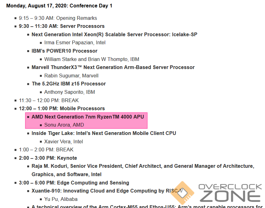 โดยที่ในปีนี้ AMD ได้เป็นผู้สนับสนุนรายใหญ่อันดับสองรองจาก Intel ทว่าเมื่อดูกำหนดการพบว่ามี AMD เข้าบรรยายแค่รอบเดียวเท่านั้น โดยเป็นหัวข้อเกี่ยวกับ Renoir APU ซึ่งดูจะไม่มีอะไรใหม่หรือน่าตื่นเต้นเท่าไหร่ ในขณะที่ Intel เข้าบรรยายถึง 6 รอบ โดยมีหัวข้อเด่นๆเกี่ยวกับ Tiger Lake CPU และ Xe GPU ส่วน Nvidia นั้นเข้าบรรยาย 4 รอบ โดยมีหัวข้อเด่นๆเกี่ยวกับ Ampere GPU และ Deep Learning