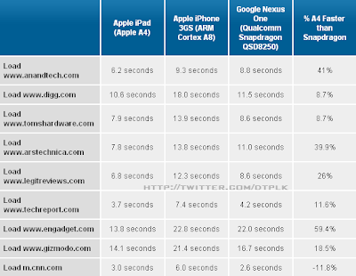 นอกจากนี้ เว็บไซต์ AnandTech ยังได้ทำการทดสอบประสิทธิภาพการทำงานด้านฮาร์ดแวร์โดยการมุ่งไปที่ซีพียู (CPU) Apple A4 SoC ซึ่งใช้ใน iPad และซีพียู Qualcomm Snapdragon ที่ใช้ใน Nexus One โดยชิปทั้ง 2 ตัวมีความเร็วของสัญญาณนาฬิกาเท่ากันที่ 1GHz และชิป ARM Cortex A8 ที่ใช้ใน iPhone 3GS ซึ่งความเร็วของสัญญาณนาฬิกา 600MHz ผลปรากฏว่าชิป Apple A4 SoC จะมีประสิทธิภาพการทำงานที่ดีกว่าดังรูปด้านล่าง