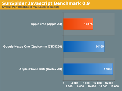 AnandTech ได้ทำการทดสอบทำงานของ Apple iPad เทียบกับ Google Nexus One และ iPhone 3GS ด้วย WebKit SunSpider JavaScript Benchmark โดยผลการทดสอบปรากฏว่า iPad ซึ่งใช้ชิป Apple A4 system-on-a-chip (SoC) ทำงานได้เร็วกว่า Nexus One ซึ่งใช้ชิป Qualcomm QSD8250 ถึง 37.6%
