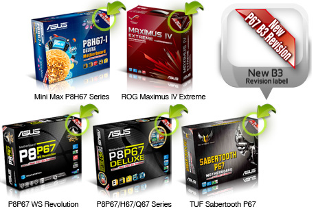 ASUS has announced that updated Intel 6 series-based motherboards will begin shipping this week if all goes to plan. ASUS is the first motherboard company that we have seen make this announcement and trust us, it is very good to see. ASUS will be placing stickers on the motherboard and the retail box in order for you to be certain if it is a new B3 stepping chipset. You can see an example of the sticker that will be on the motherboard in the image below. You can see all the other ways to tell what board you have by following the permalink below to the forums.