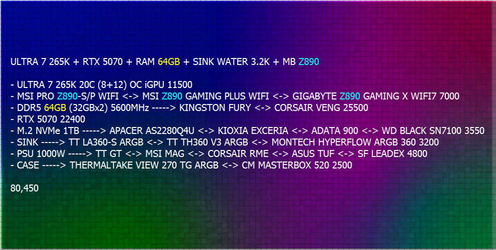 ULTRA 7 265K + RTX 5070 + RAM 64GB + SINK WATER + MB Z890 + 2 x SSD