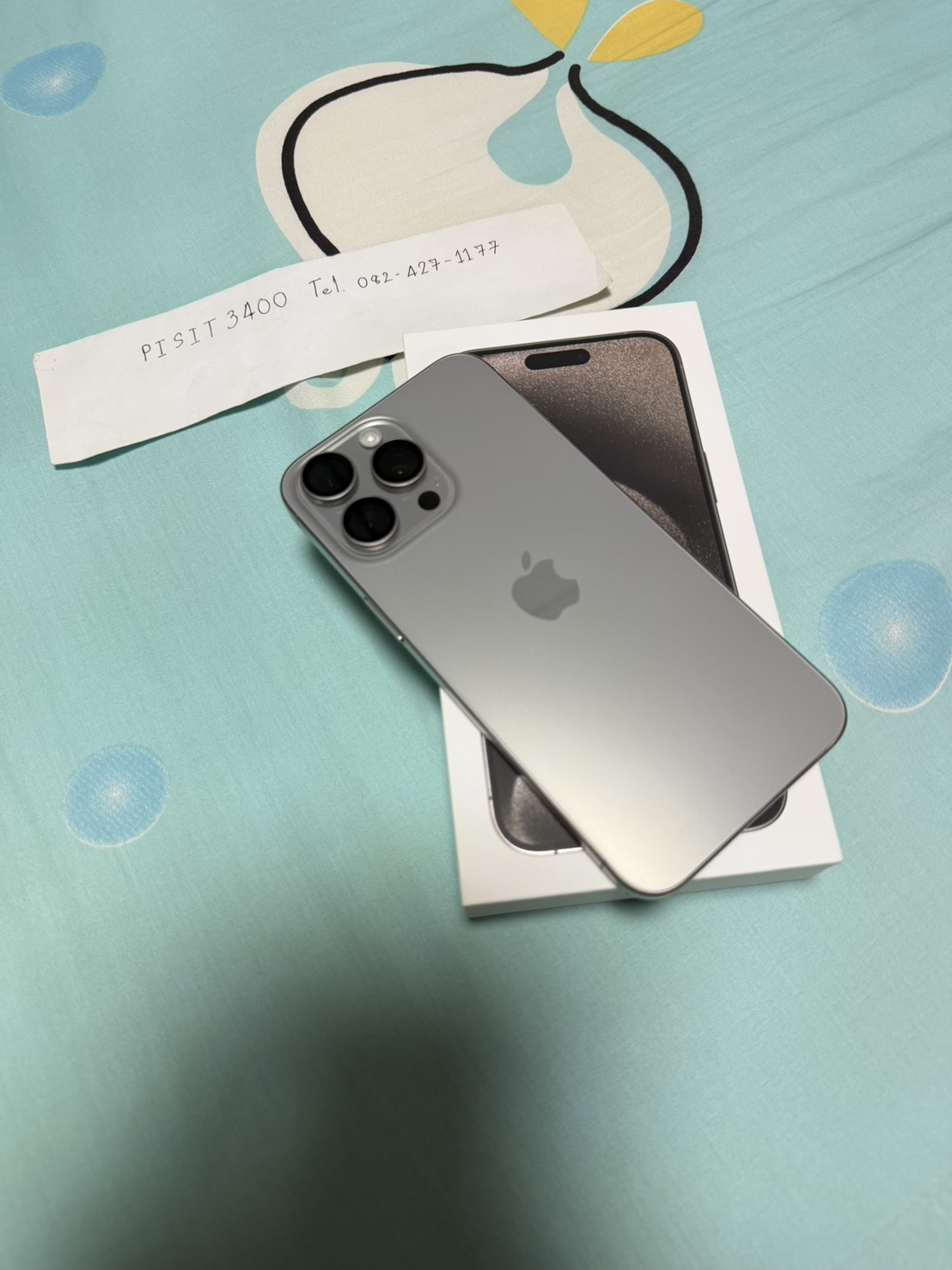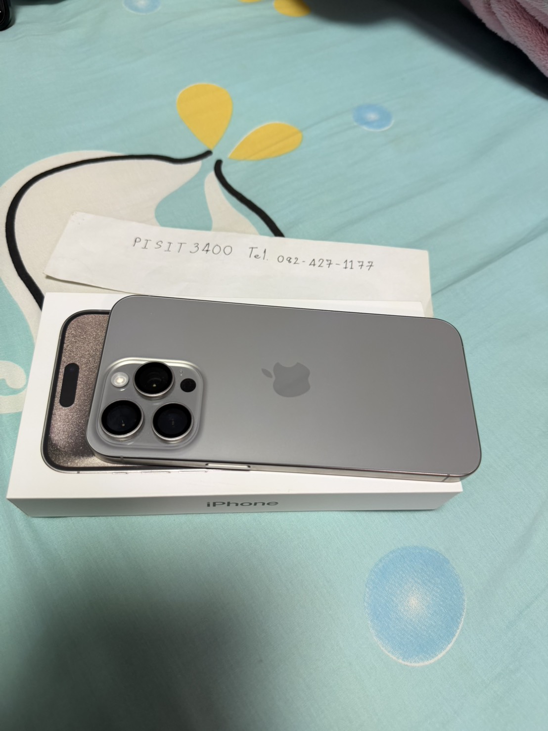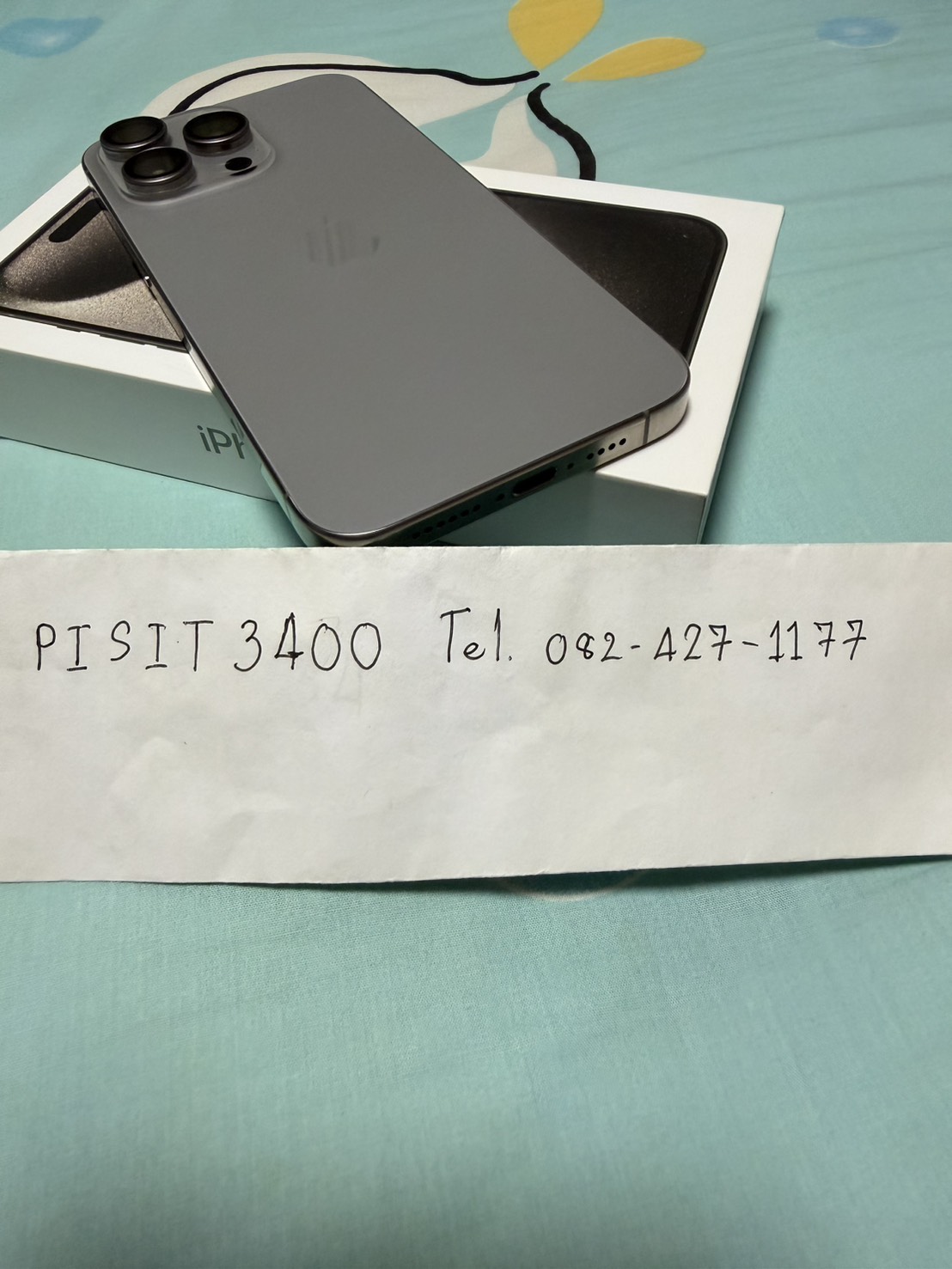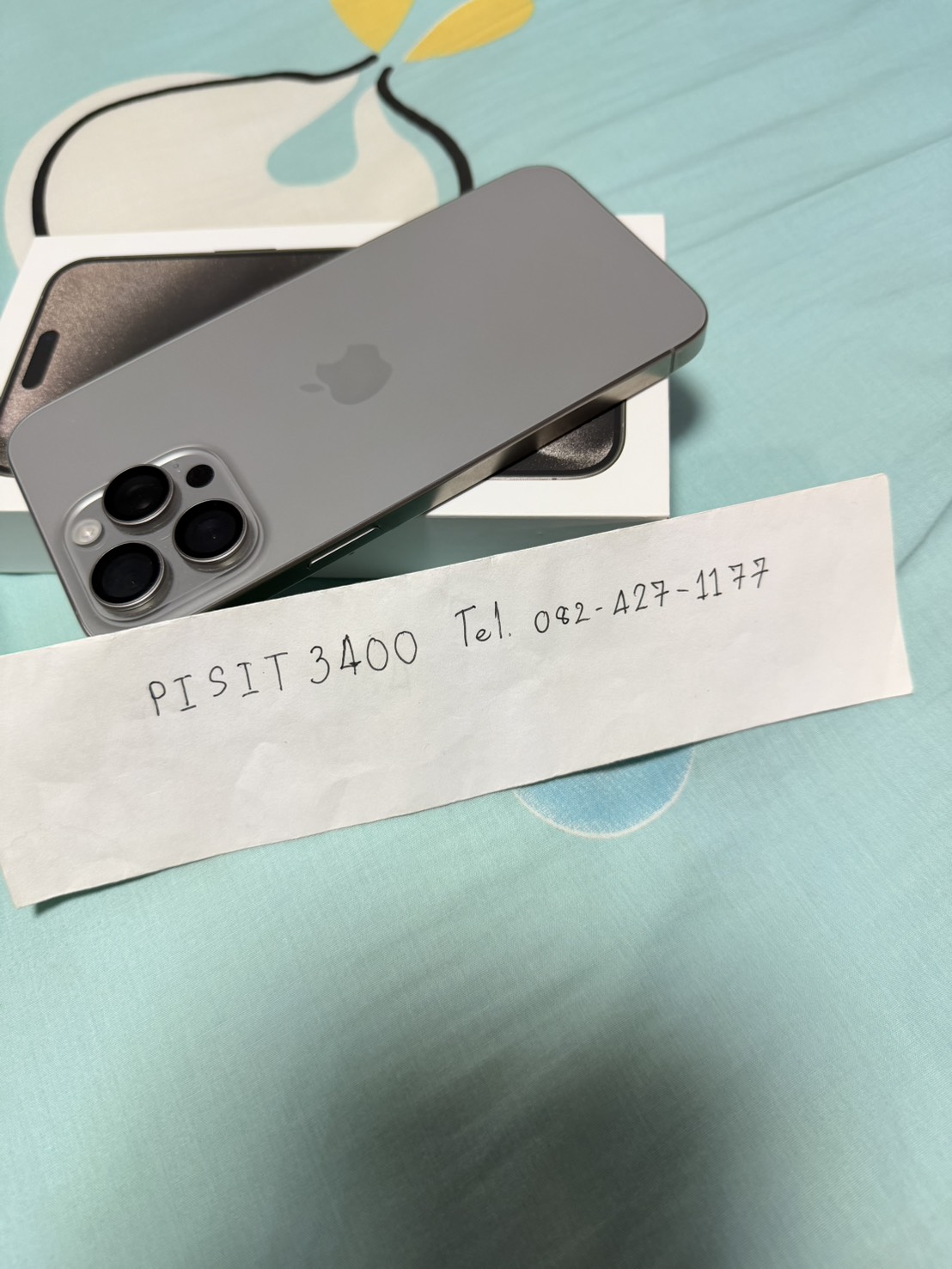อุปกรณ์ (device): ตามรูป iPhone 15 Pro Max สี Natural Titanium, 256 GB มีเฉพาะตัวเครื่อง