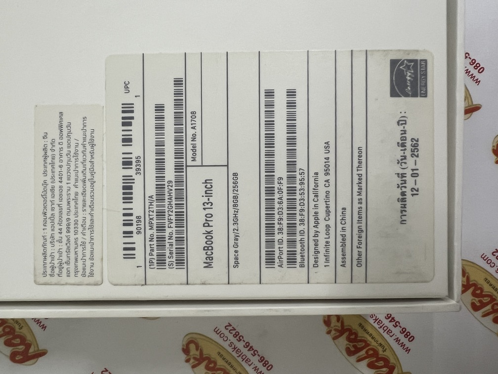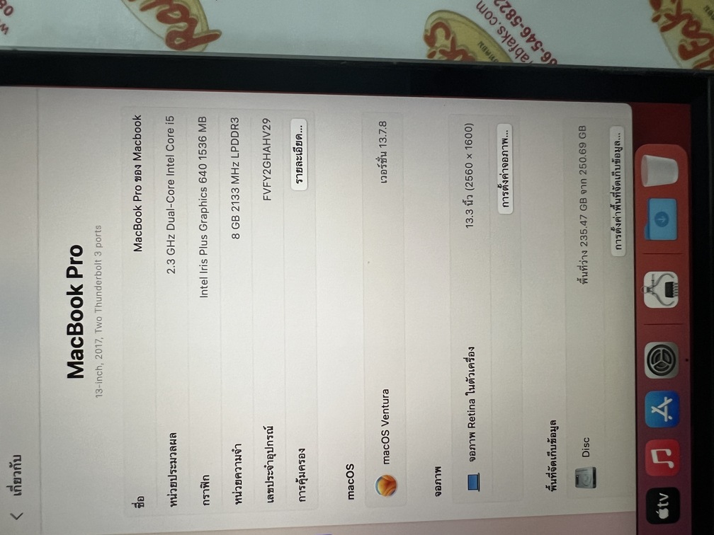 ประกาศขาย Macbook ตัวPro ปี2017 มีทัศบาร์ จอ13.3นิ้ว รุ่น MacBook Pro (13-inch, 2017, Two Thunderbolt 3 Ports) CPU intel core i5 2.3GHz RAM8GB SSD256GB จอ13.3inch Retina(2560 x 1600) Cycle Count 139 สภาพสวย89% มีรอยนิดหน่อยโดยรวมแล้วสวย สีSpace Grey เครื่องศูนย์ไทย อุปกรณ์ครบกล่องมี ตัวเครื่อง+Adapter+สายชาร์จType C+คู่มือ+กล่อง Restoreเครื่องให้ใหม่แล้วพร้อมใช้งานได้ทันที ไม่ติดiCloud ประกันหมดแล้วแต่ใช้งานได้100%