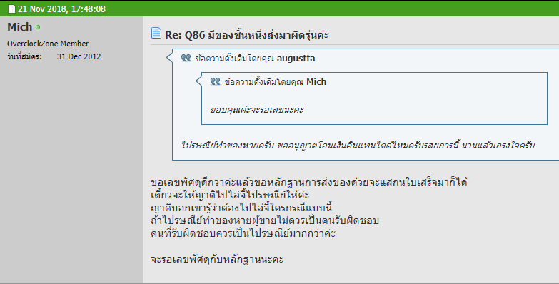 จึงได้ pm ถาม คุณ augustta ตอบกลับมาว่าจะเช็คให้ แต่หายไปราวๆ 2 วันไม่ตอบกลับฉันก็ได้ pm ไปถามอีกทีได้คำตอบกลับมาว่าไปรษณีย์ทำของหายจะโอนเงินคืนเพราะเกรงใจ (ซึ่งฉันรู้สึกไม่โอเคเพราะเสียค่าส่งของกลับไปเปลี่ยนแล้วนี่หมายถึงจะต้องเสียเงิน+เวลาเปล่าแถมไม่ได้ของที่ต้องการอีกเหรองั้นจะลำบากส่งกลับไปทำไมตั้งแต่แรก)