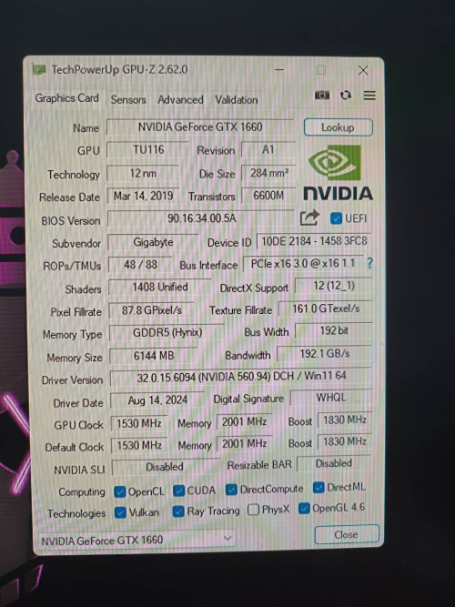 Gigabyte GTX 1660 6GB GDDR5 192Bit ต่อไฟเพิ่ม8Pin ไม่มีกล่องเดิม แต่ใส่กล่อง1660Tiไปให้