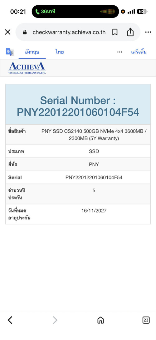 10.ขายM.2มือสอง PNY CS2140- PCIe 4/NVMe M.2 2280 500GB
