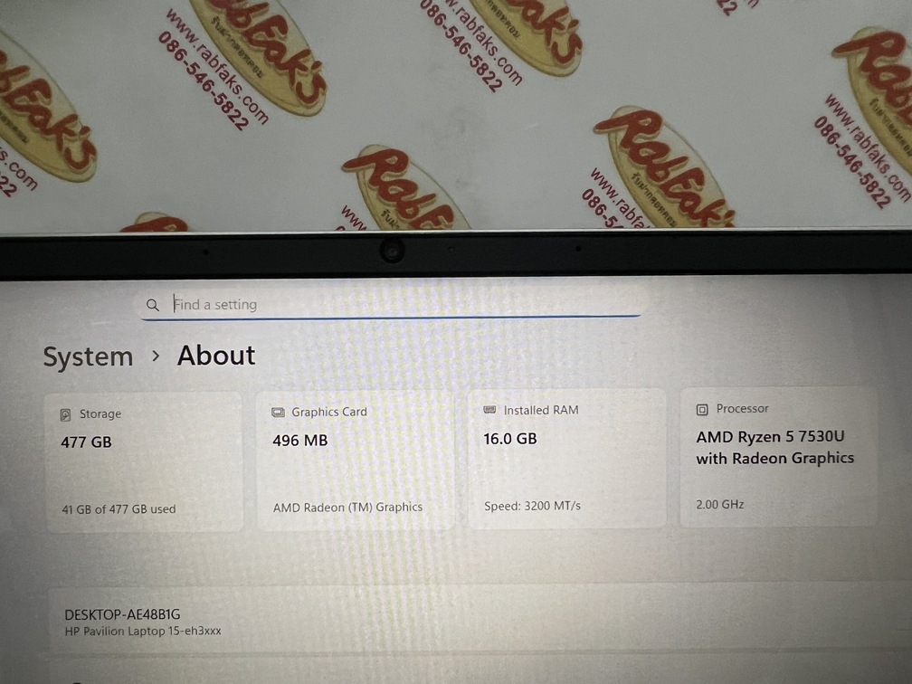 ประกาศขายโน๊ตบุ๊คสเปคแรงๆเป็นรุ่น HP Pavilion 15-eh3035au CPU AMD Ryzen 5 7530U/RAM16GB/SSD512GB จอ15.6นิ้ว (1920×1080) Full HD เครื่องสีNatural Silver สภาพสวย89% จอมีรอยทับคีย์บอร์ดตามรูป มุมมีรอยบุบ1มุมตามรูป(ไม่มีผลต่อการใช้งาน) อุปกรณ์มี ตัวเครื่อง+สายชาร์จ รีเซ็ตWindowsให้ใหม่แล้วพร้อมใช้งานได้ทันที ประกันหมดแล้วแต่ใช้งานได้100%