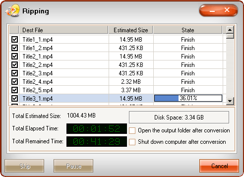 When you get all the settings to your choice, click on the "Start" button and the checked files will be listed on the "Ripping" window for conversion.